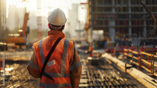 A construction worker in full protective gear stands amidst the hustle of a building site, the hardhat and safety vest marking them as a vital part of the team.