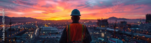 A construction worker in safety gear stands on a high vantage point, overlooking a cityscape at sunset with a vibrant sky and urban development in the background.