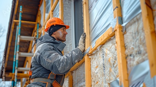 A construction worker inspects insulation on a building site, demonstrating safety and craftsmanship in housing development.
