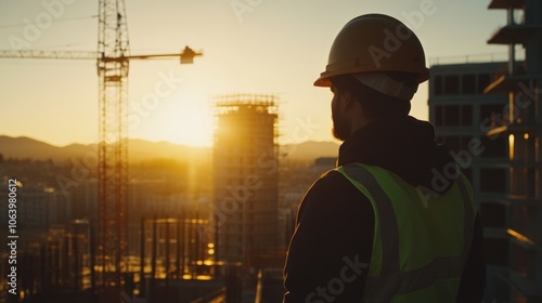 A construction worker observes a sunset over a building site, symbolizing progress and labor.