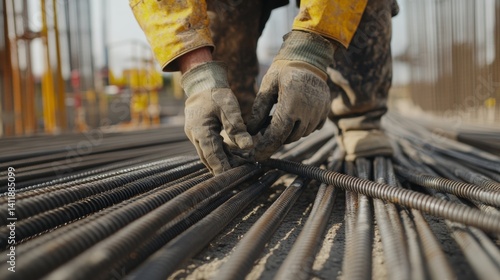 A construction worker securing steel rods at a building site. Featuring precision and strength