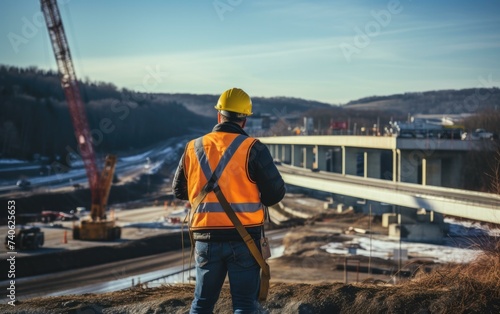 A construction worker standing on a hill overlooking a highway. Generative AI.