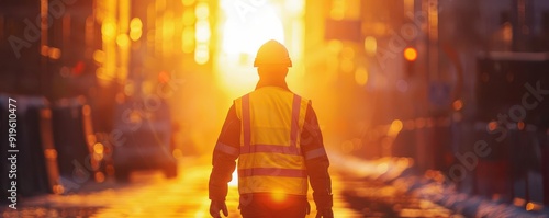 A construction worker walks towards a bright sunset, illustrating resilience and determination in fieldwork. Vibrant colors enhance the scene.