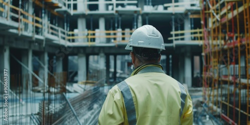 A construction worker wearing a yellow jacket and a hard hat stands in front of a building. Concept of hard work and dedication to the job