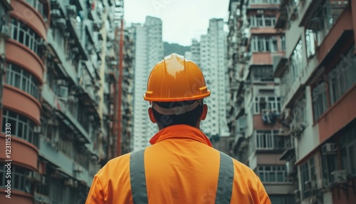 a construction working in orange uniforn and helmet is looking at the building which is being constructed from back side view