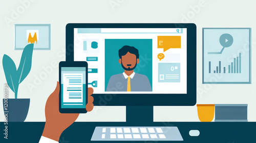 A consultant s hand holding a phone during a virtual meeting, with business apps open on the screen, virtual consulting call, mobile consulting