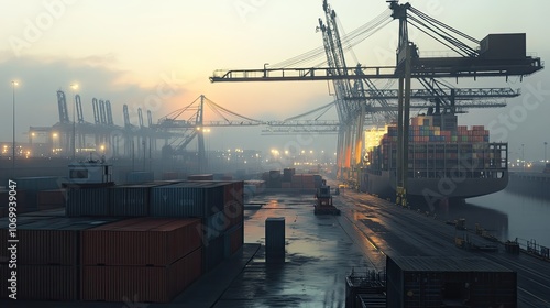 A container ship is docked at a busy port, with cranes loading and unloading cargo.