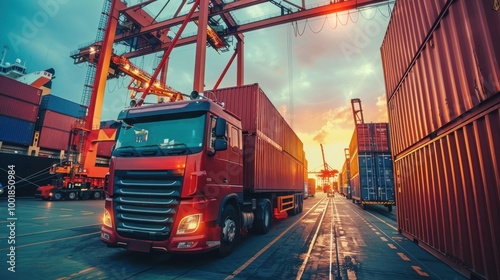 A container truck with its back doors open, being loaded with goods by a crane bridge at a vibrant shipyard, with cargo ships and planes in the background, capturing the essence of export logistics