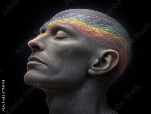 A contemplative male figure showcasing colorful energy patterns flowing across the head embodying the concept of mental illumination and cognitive awareness through visual expressiveness