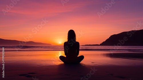 A contemplative silhouette sits in meditation on the beach, with the sun setting in a dramatic sky behind