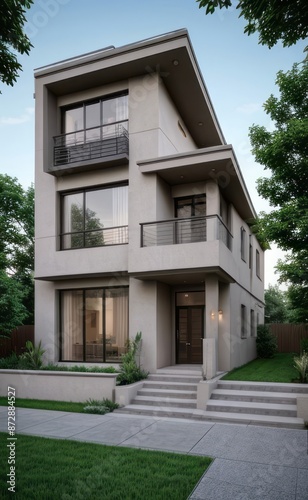 A Contemporary Dwelling with Stylish Architecture, Beautiful Exterior Design, and a Serene Garden Setting. Perfect Family Home in a Residential Neighborhood, Featuring Thoughtful Construction