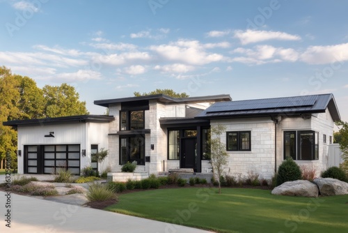 A contemporary home featuring a stylish design and solar panels is beautifully surrounded by vibrant greenery on a bright, clear day in a peaceful suburban neighborhood