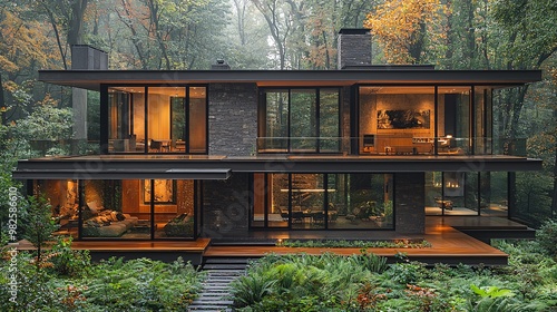 A contemporary house in the forest with a glass walkway connecting different sections, blending nature with modern design