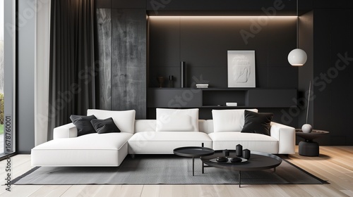 A contemporary living room with a white sofa, black accents, and a minimalist design, exuding sophistication