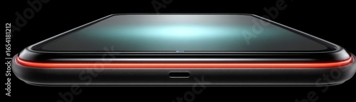A contemporary mobile smartphone s back panel glows intensely with a vibrant red light creating a futuristic and technological aesthetic against a dark shadowy background.