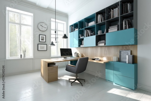 A contemporary office design with a light teal and walnut wooden wall unit, offering integrated shelving