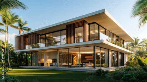 A contemporary villa designed with large glass windows and natural wooden slats that enhance the minimalist architecture