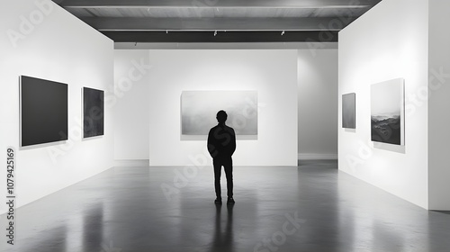 A contemporary web design for an online art gallery, focusing on large, high-quality images, minimal text, and a sleek, user-centered interface.