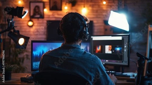A content creator working on a marketing video, with a camera, lights, and editing software in use