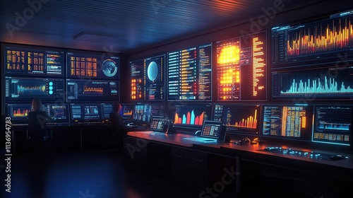 A control room with glowing dashboards showing cloud data analytics, IT professionals managing systems in realtime, cinematic focus