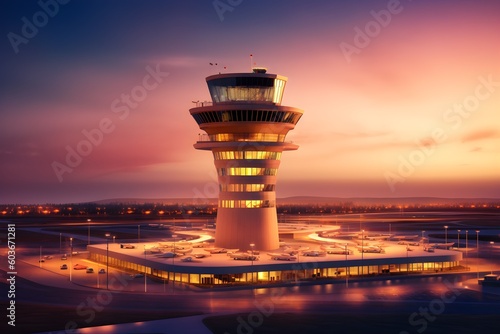 A control tower overlooking a sprawling airport runway at dusk. Generative AI