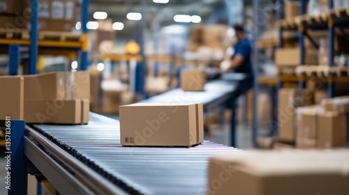 A conveyor belt in a warehouse with cardboard boxes being transported for sorting.