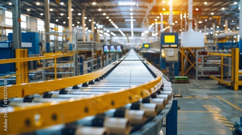A conveyor belt system in a factory with multiple stages of assembly for solar panel components and automated machinery in the background. . AI generation.