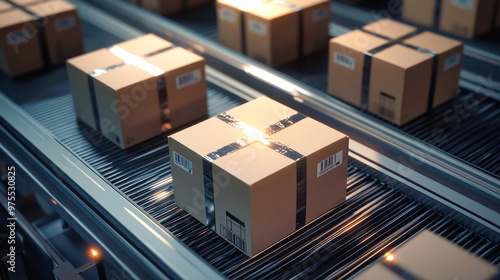A conveyor belt transports neatly arranged boxes in a contemporary warehouse setting, showcasing efficient sorting processes under dramatic lighting