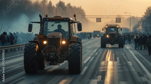 A convoy of tractors with activated lights participating in a rally on a busy urban road.