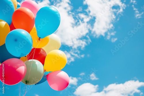 A copyspace concept showcasing colorful balloons against a backdrop of picturesque clouds and a blue sky, providing ample space for text or design elements