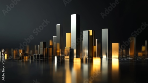 A corporate bar graph with silver and gold bars, representing financial performance, set against a dark background with subtle reflections and floating labels.