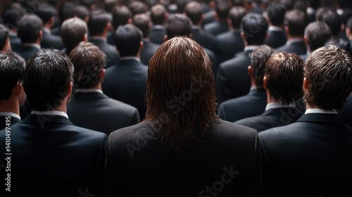 A corporate gathering where every worker is identical, except for one with a missing heart.