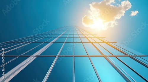 A corporate skyscraper with large, reflective windows, standing tall against a bright blue sky in a business district.