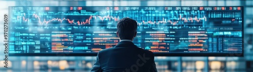 A corporate titan in a sleek, highrise boardroom overseeing the global market with a futuristic control panel showing fluctuating stock prices and currency exchange rates