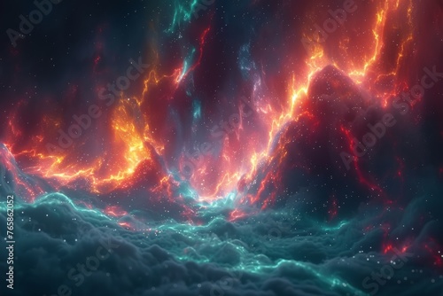 A cosmic dance of fiery red and cool teal nebulae, swirling in the vastness of the starlit universe.