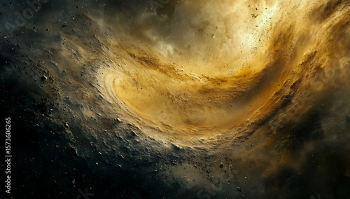 A cosmic dust storm in space, where swirling sand and dirt particles create an abstract, dynamic shape, like waves or circular formations, evoking a sense of motion and mystery.