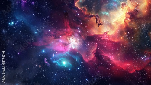a cosmic journey through a universe of swirling galaxies and nebulae, white space in the center of the page for text, bold and dynamic hues against a dark background