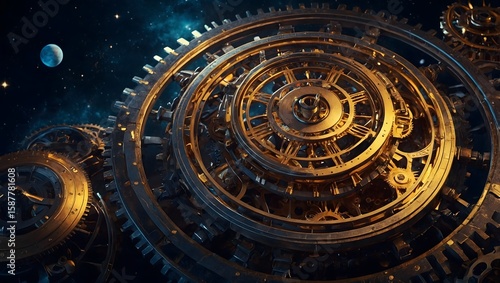 A cosmic mechanical system where planets rotate like gears, starry space background, steampunk celestial design, glowing metal elements, high contrast lighting, detailed concept art, no people