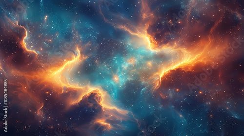 A cosmic nebula featuring a palette of cool blues and warm oranges, with swirling patterns and smoky textures, symbolizing the infinite and ever-changing nature of the universe. Infinite. Illustration
