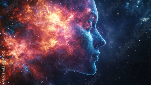 A cosmic nebula shaped like a human face, symbolizing the universe contemplating its own existence.