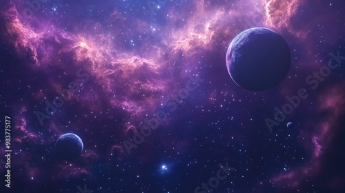 A cosmic scene of planets floating above glowing nebulae, surrounded by distant stars in the infinite space