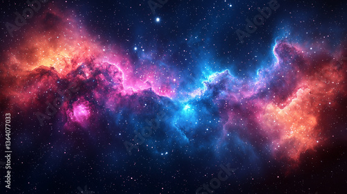 A cosmic scene where nebula-like clouds swirl in space, glowing in hues of blue, purple, and pink.