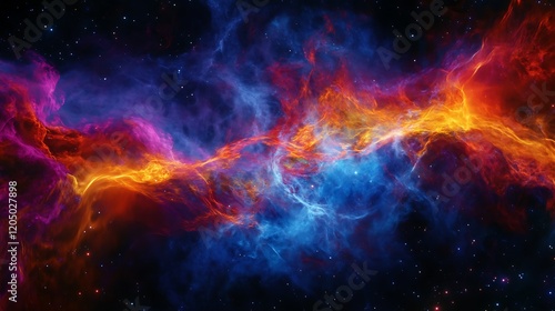 A cosmic spectacle showing a supermassive black hole distorting space-time, with vivid colors representing the immense gravitational forces