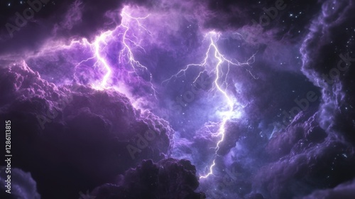 A cosmic storm erupts within a nebula, sending neon-colored lightning bolts through space