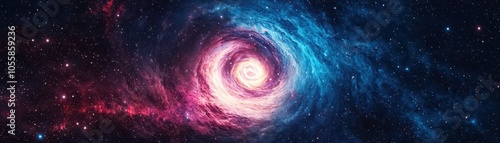 A cosmic swirl of pink and blue nebulae with a bright star in the center.