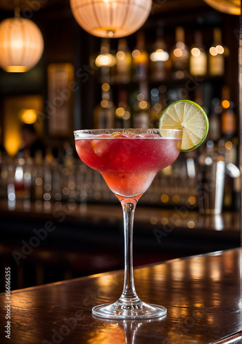 A Cosmopolitan cocktail sits on a wooden bar top, nestled in the inviting ambiance of a cozy bar, with a blur of alcohol bottles in the background.