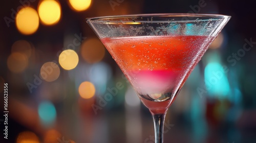 A cosmopolitan cocktail with a bright pink hue is elegantly served in a stylish glass. The drink is garnished with a lime slice and a salt rim, creating a refreshing look at a lively bar setting