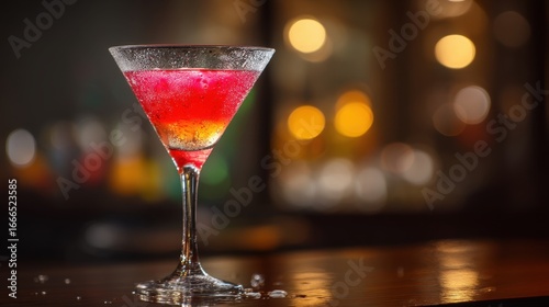 A cosmopolitan cocktail with a bright pink hue is elegantly served in a stylish glass. The drink is garnished with a lime slice and a salt rim, creating a refreshing look at a lively bar setting