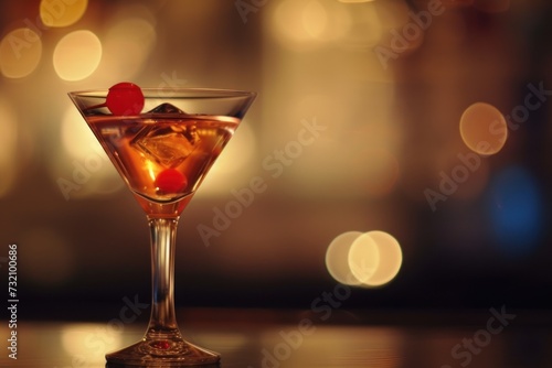 A cosmopolitan in a martini glass with a warm bokeh backdrop with copy space, perfect for an upscale bar's elegant drink menu or bar advertisement