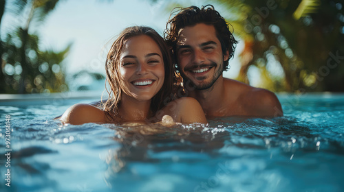 a couple , boyfriend and girlfriend, lovers are dating and hang out in the pool during the vacation to the beach resort ,